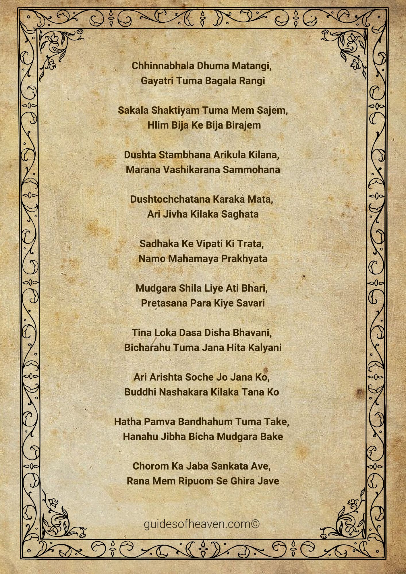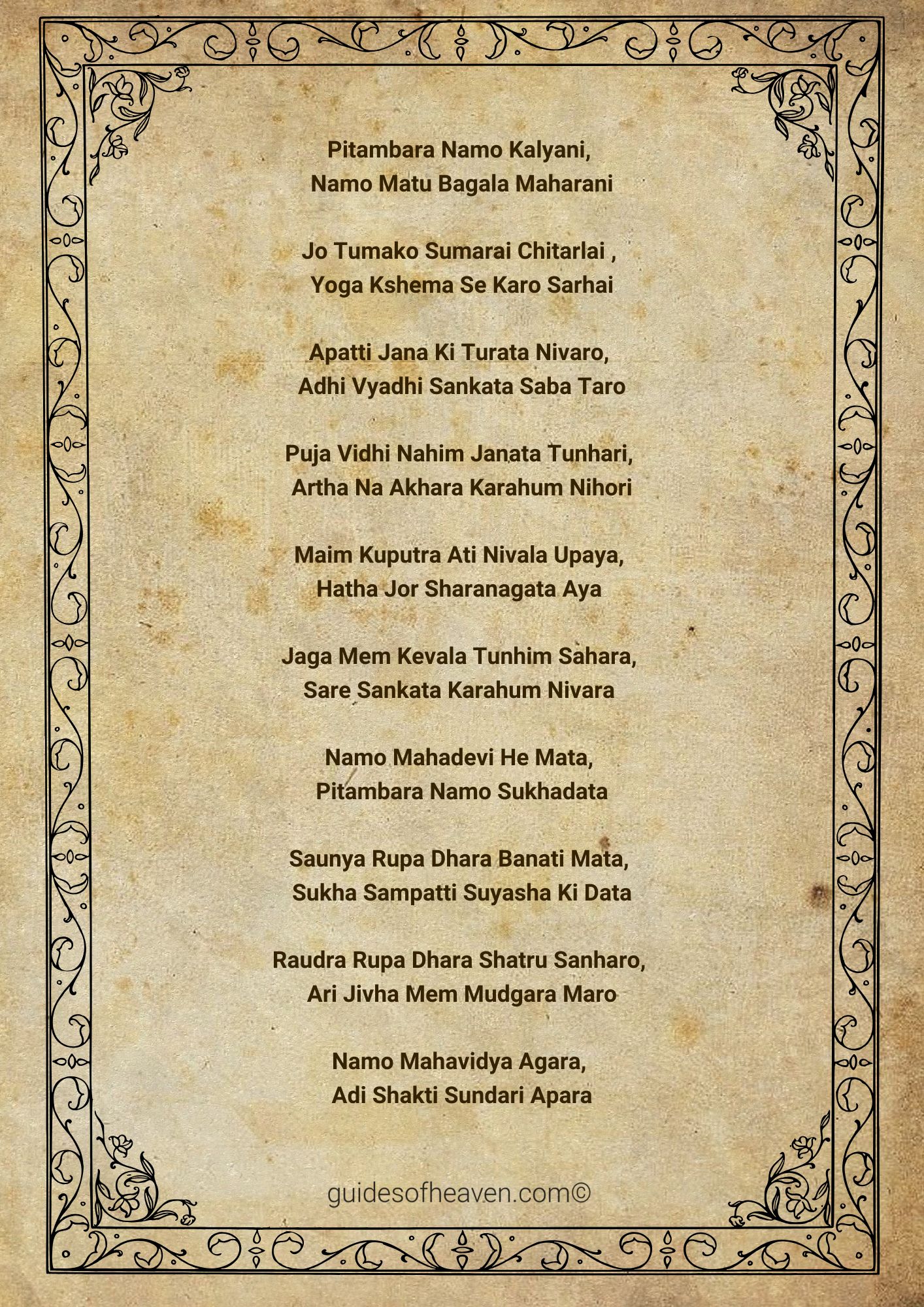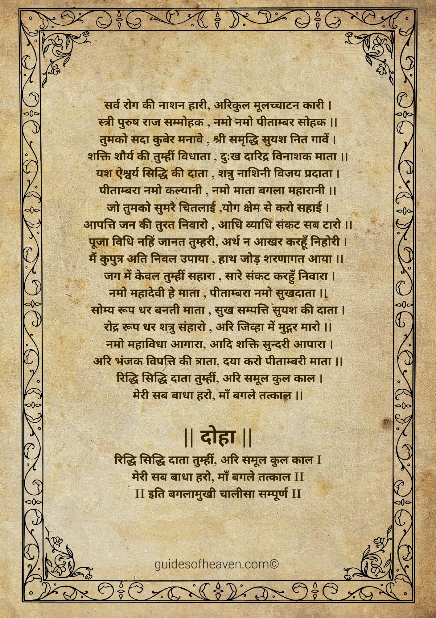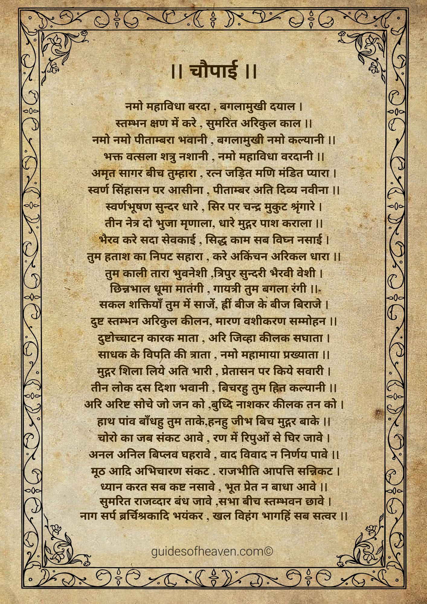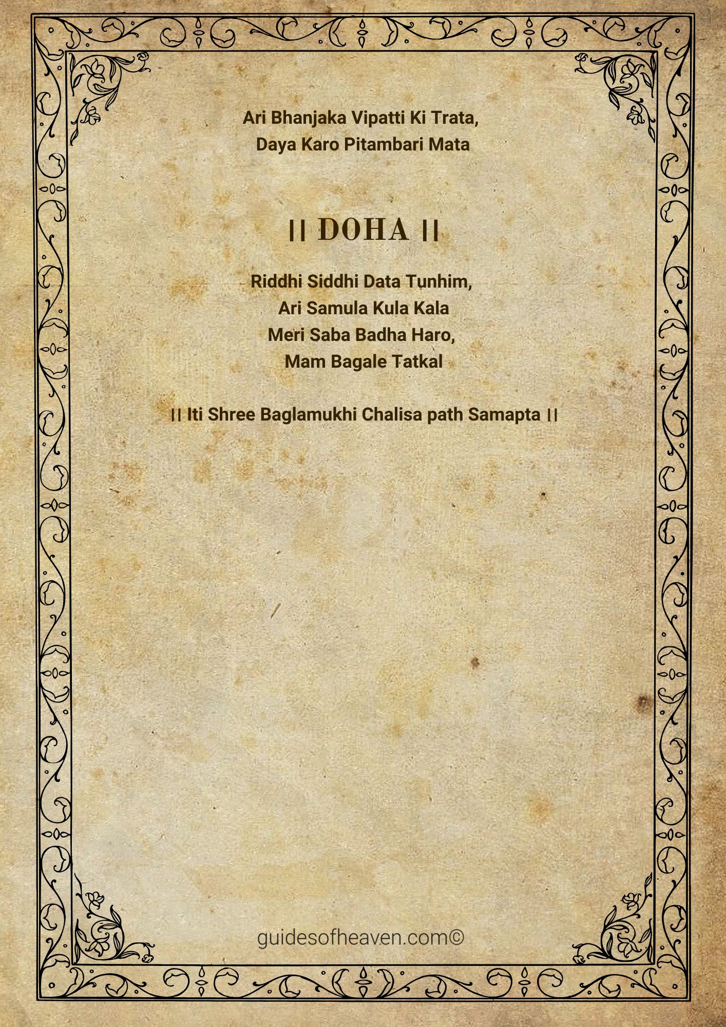 Similar to most Hindu gods, Maa Baglamukhi is glorified in a Chalisa, a hymn of 40 verses (chaupais) that is sung in her honour. The Baglamukhi Chalisa is a beautiful prayer which summarizes the stories, virtues and blessings of the goddess in simple Hindi poetic verses. The believers are of the view that by reciting the Chalisa regularly they can attract the protection and grace of Mata in their lives.