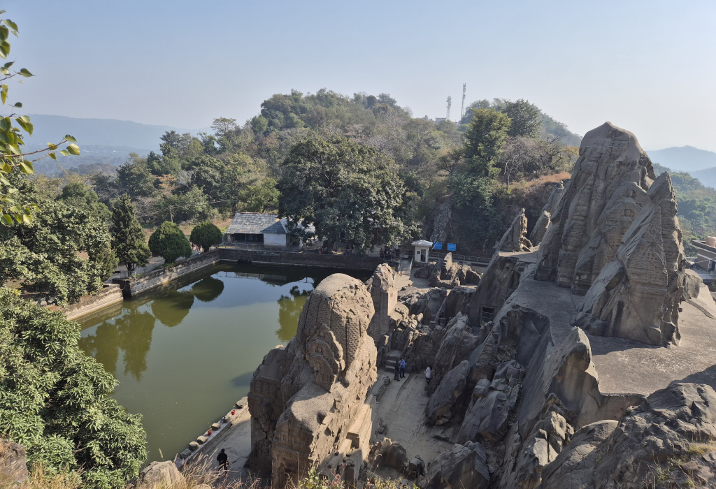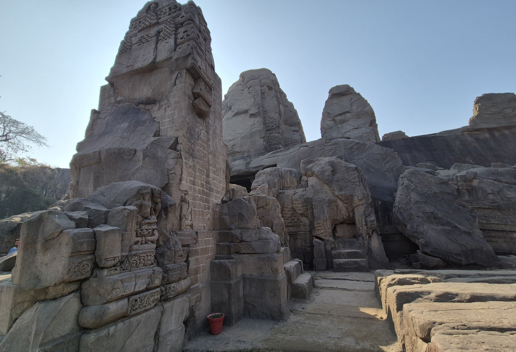 The design is well-thought and symmetrical. There is a central temple with smaller shrines in a grid-like arrangement. There were originally four entrances (one on each side), but three are now finished or in sight. Every temple has a square sanctum (garbhagriha) of the deity. The largest was the central main shrine, known as Thakurdwara. The relief carvings of gods, goddesses and epic scenes are found on the walls and pillars throughout the complex. The layout is similar to a religious mandala (symbolic diagram of the universe), which is not typical of rock-cut temples and demonstrates the religious symbolism of the designers.