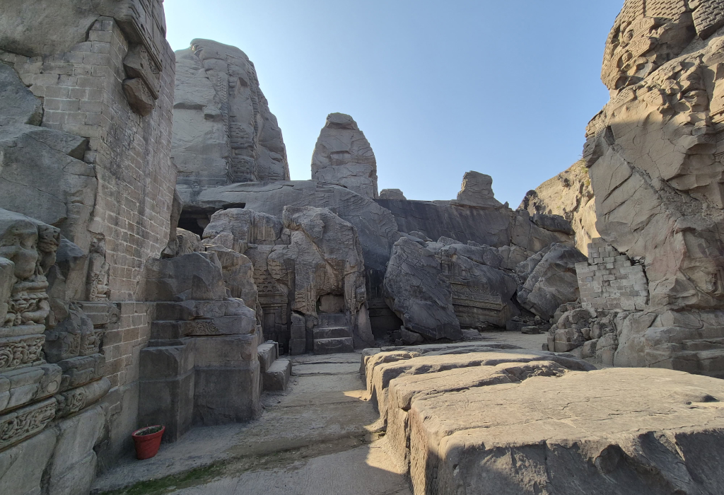The temples of Masroor were hewn out of one hill of sandstone. The builders first excavated trenches to separate a huge rock mass. Then they cut out the stone above and round it, and carved out the rooms within and the spires above, and hewn downwards. They literally carved the temples out of rock instead of building them with blocks. This is a high-level, top-down carving that is not common. It took careful planning and craftsmanship to create the single block of 15 temples that we are currently looking at.